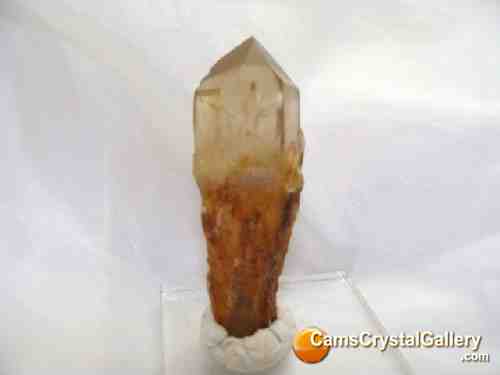 Natrual citrine. Lightbrary refers to the ""teacher"" crystal surrounded by the smaller ""student"" crystals. There is some micro damage on the tip", but otherwise a brilliant specimen. Citrine is believed to bring wealth into ones household and is believed to be great for transferring positive energy (feng shui) and grounding any negative energy.