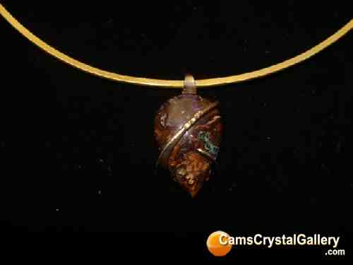 This is an Opal from Koroit Australia. It has splashes of red and green opal in channels through the matrix. It has been set by Cranston in 14 kt gold filled. It is a nice elegant piece. Opal brings on psychic vision and is said to be a karmic stone. T