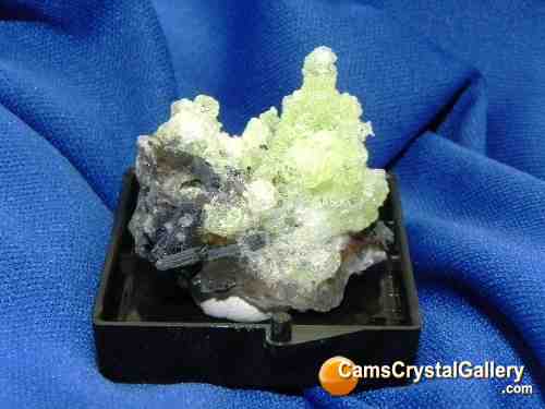 This is some of the most fluorescent hyalite opal that I have ever seen. Even in natural light it is green, and when a UV light is turned on it, WOW! It glows! It is perched on a nice terminated smokey quartz and sits in a thumbnail box. Notice the measurements in mm and not cm.